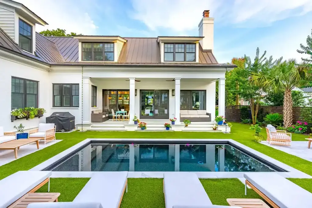 This luxurious concrete rectangle pool features a beautiful Cadet Blue Signature Matrix surface and Arctic Bay quartzite coping. With a brushed concrete hardscape and elevated design, the pool offers both durability and aesthetic appeal, creating the perfect centerpiece for outdoor relaxation and entertainment.